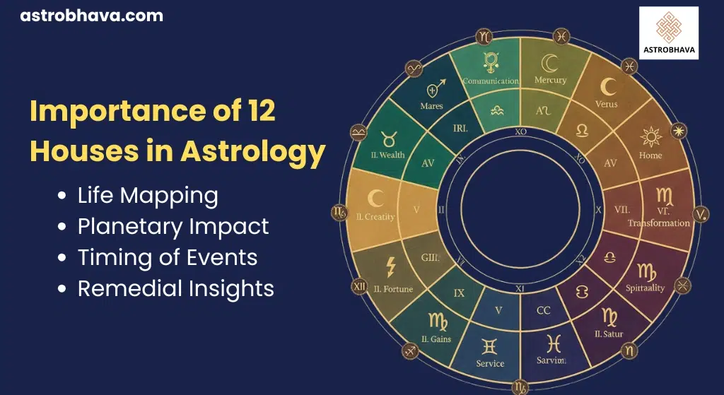 The 12 Houses in Astrology and their lords hold the secret map of your life. From your ambitions to relationships and spiritual path, everything is reflected within these houses. Understanding the importance of 12 Houses in Astrology allows you to make conscious choices aligned with your destiny.