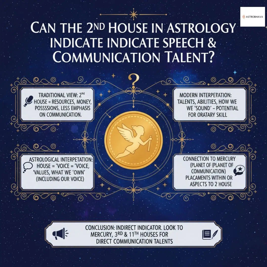 Yes. The 2nd house rules speech, language, and expression ability. This influences how persuasively you speak and the impact your words create. Orators, singers, politicians, and influencers often have strong 2nd house placements.