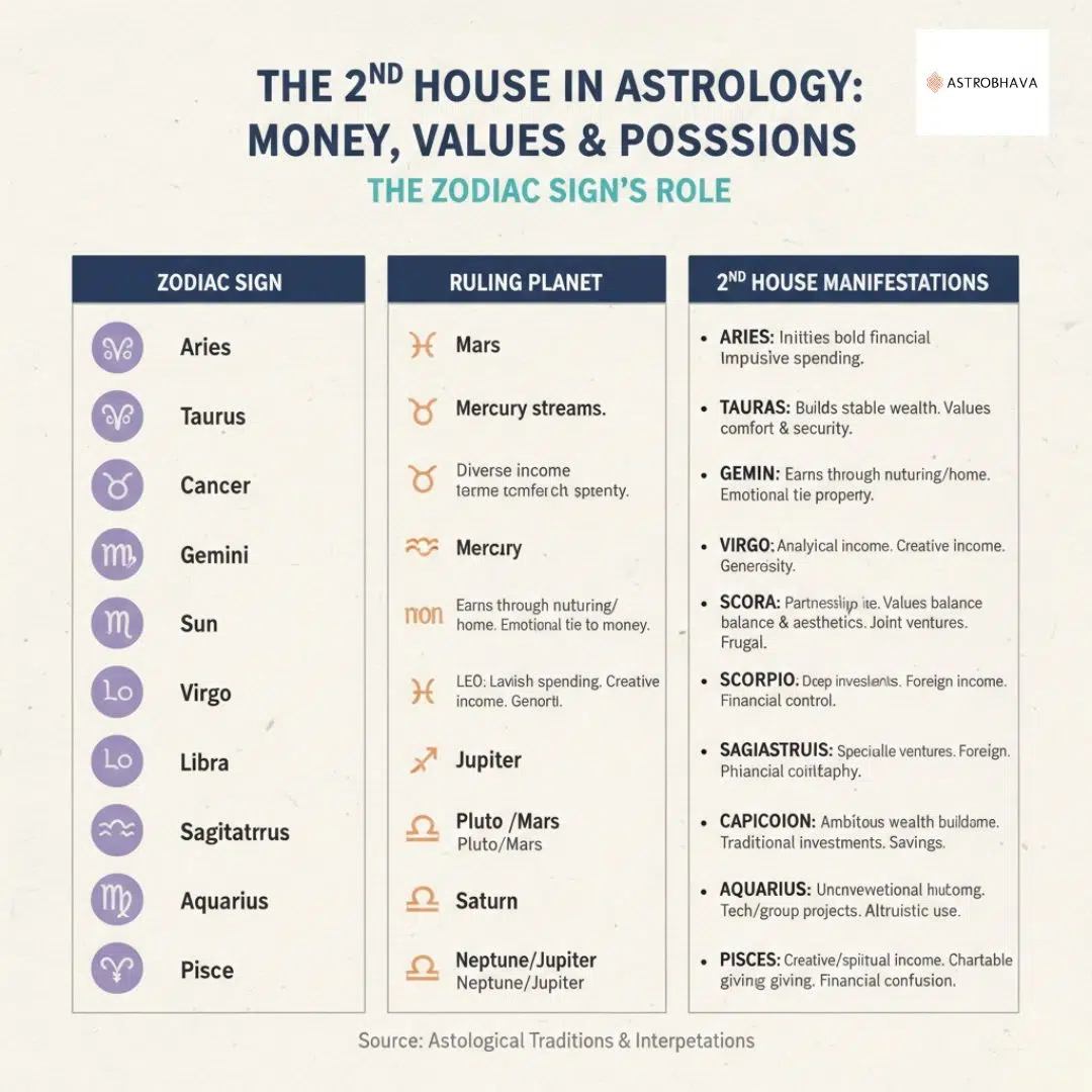 The zodiac sign occupying your 2nd house in Astrology defines your style of earning and spending. Each sign expresses unique financial behavior and emotional attachment to possessions.