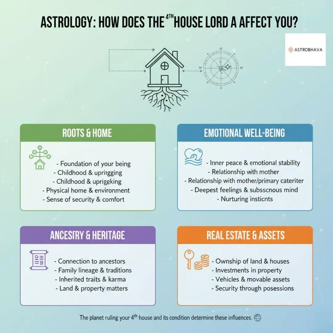 The 4th house lord is the planet ruling the zodiac sign on your 4th house cusp. For example, if your 4th house is in Libra, Venus is your 4th house lord.