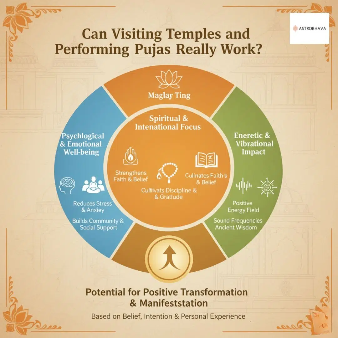 Temple visits and pujas harness collective spiritual energy. Ancient Vedic practices were designed to invoke cosmic harmony through sound (mantras), light (lamps), and offering (flowers, food).