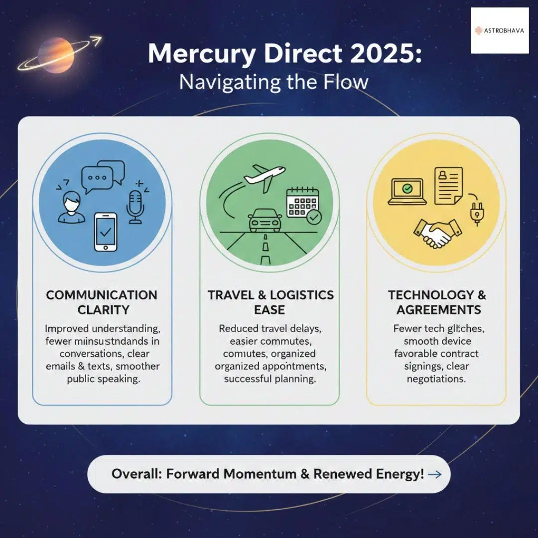 Mercury Direct happens when the planet appears to move forward in the sky again after a retrograde period. Since Mercury rules communication, technology, travel, contracts, logic, thinking, and decision-making, its direct motion brings clarity, stability, and progress.