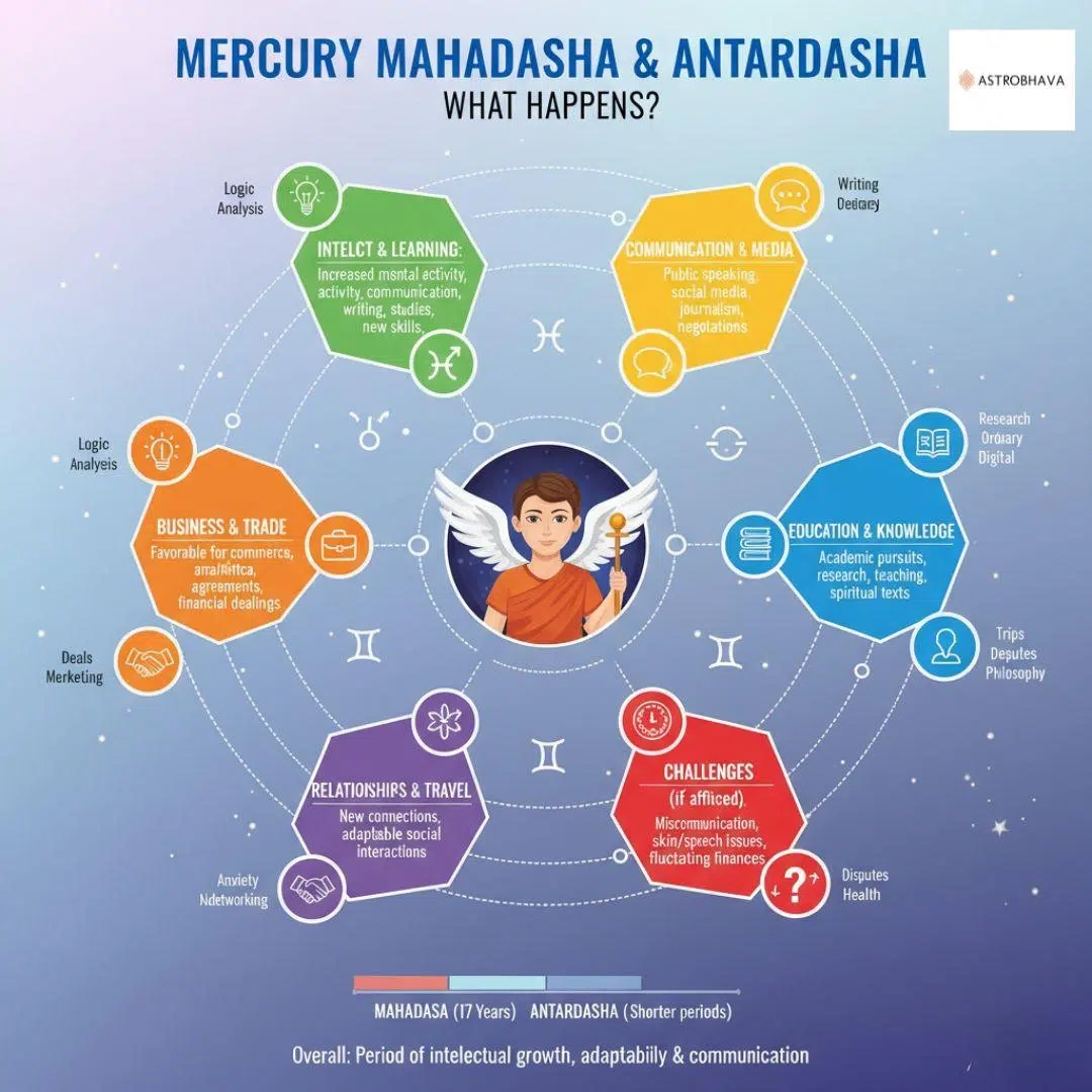 In Vedic astrology, Mercury Mahadasha (a 17-year planetary period) enhances learning, communication, trade, and intellectual growth. Individuals often experience educational success, mental clarity, and business progress.