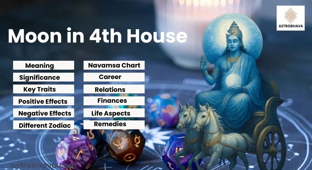 The Moon in 4th House Navamsa shows deep emotional attachments that continue into married and spiritual life. In the Navamsa chart, which reveals inner strength and destiny, Moon’s placement in the 4th house enhances the desire for peace, love, and nurturing partnerships.