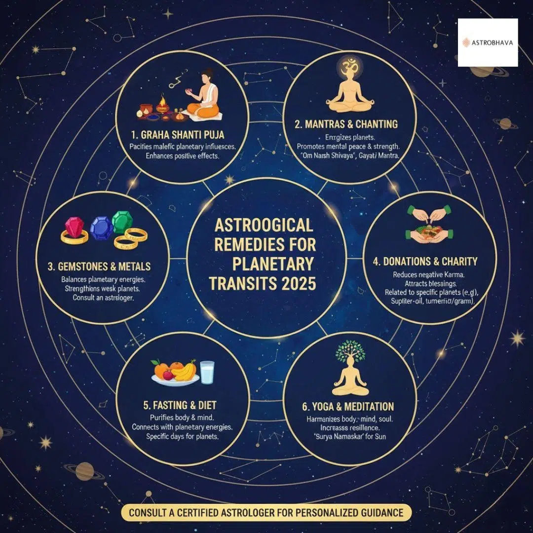 Planetary transits 2025 can amplify stress or uncertainty. Applying Vedic remedies helps balance their energy. Common practices include: