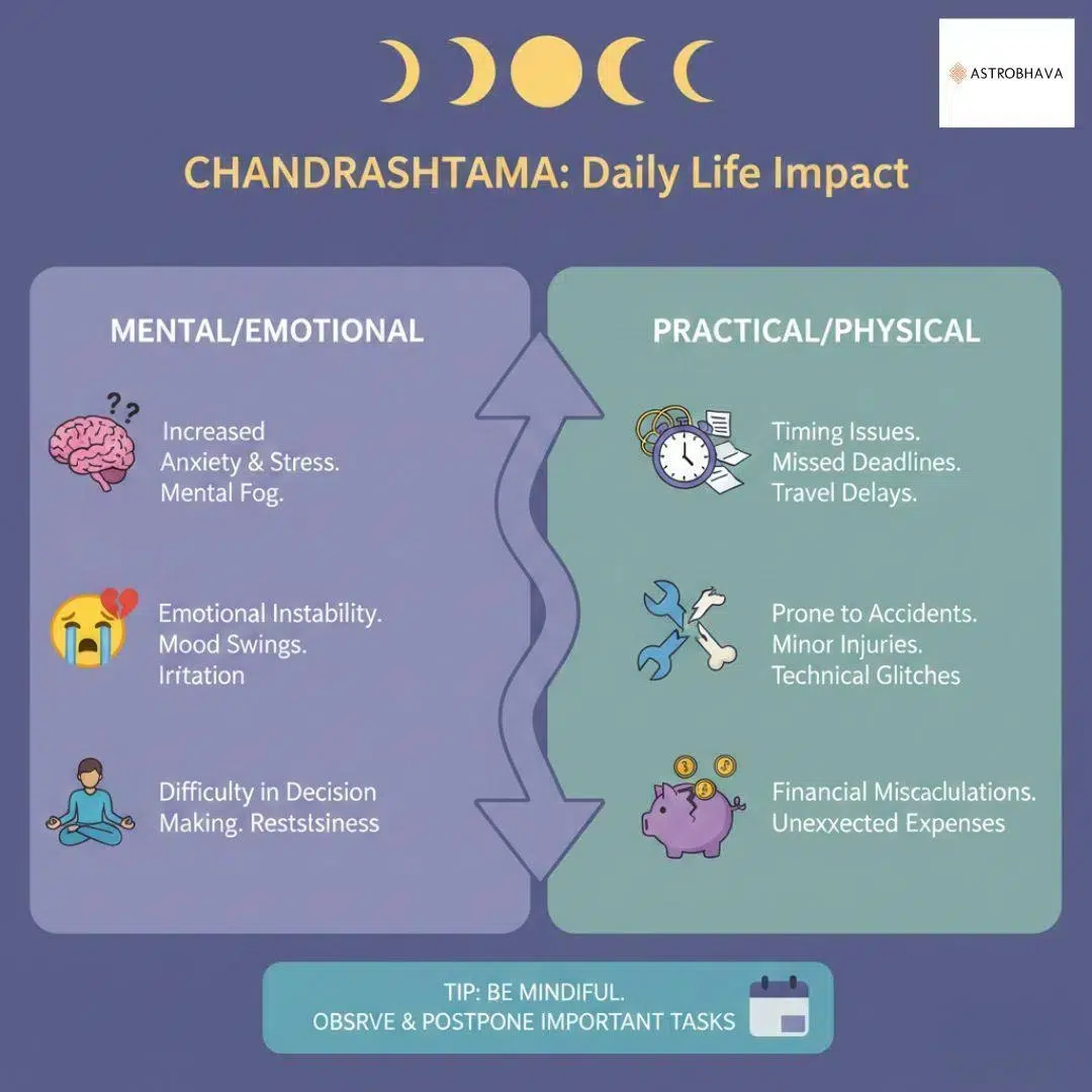 - During Chandrashtama, the Moon transits the 8th house from the natal Moon, a psychologically sensitive zone.