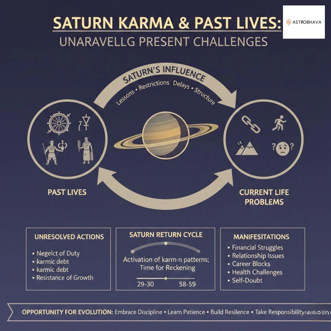 According to Vedic astrology, Saturn carries unresolved karmas from previous lifetimes into the present one. These karmas often manifest as repeated delays, authority conflicts, or long-term struggles without clear reasons.