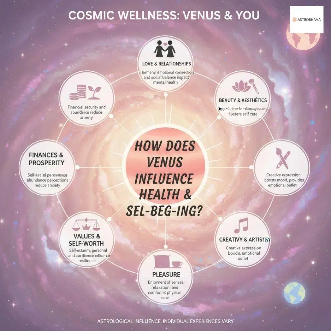 Venus governs aspects of beauty, relaxation, and lifestyle, which indirectly affect health and well-being. Here’s how: