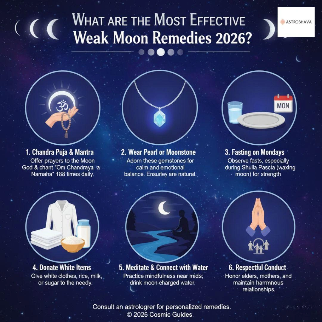 A weak Moon in your horoscope may bring emotional challenges, but with the right approach, you can restore balance and peace in your life. By following weak moon remedies 2026, such as chanting mantras, wearing gemstones, practicing meditation, observing dietary rules, and performing charity, you can enhance lunar energy effectively.