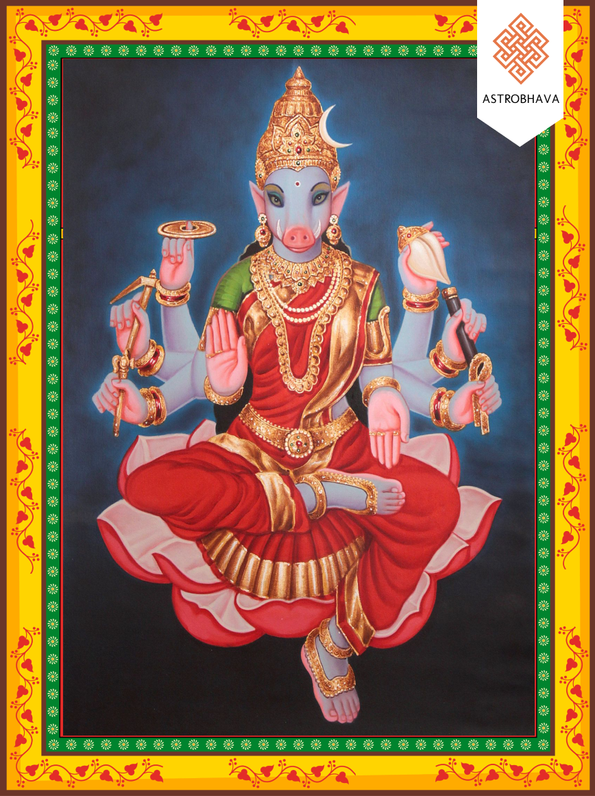 Sit in a clean, quiet space facing east or north. Keep a small lamp and water nearby. Mentally chant the deity’s Moola Mantra “Om Aim Hreem Kleem Varahyai Swaha” and focus on your intention.